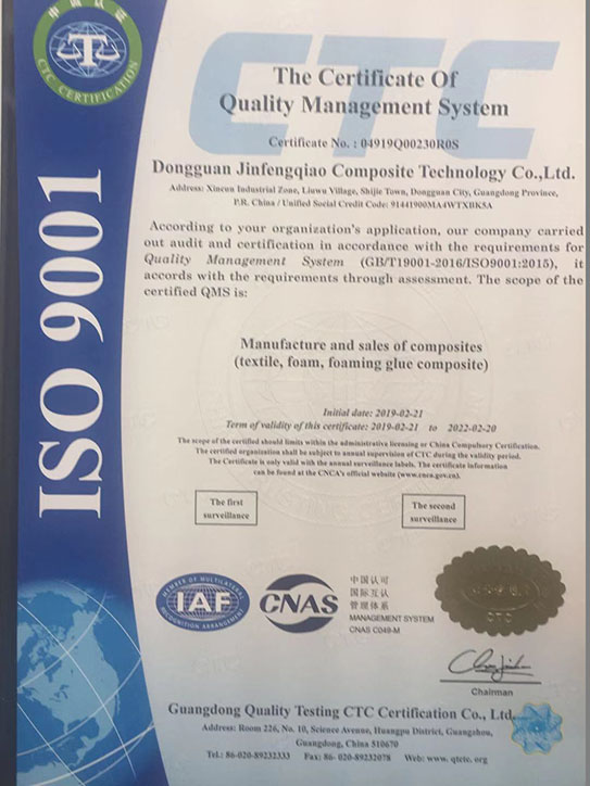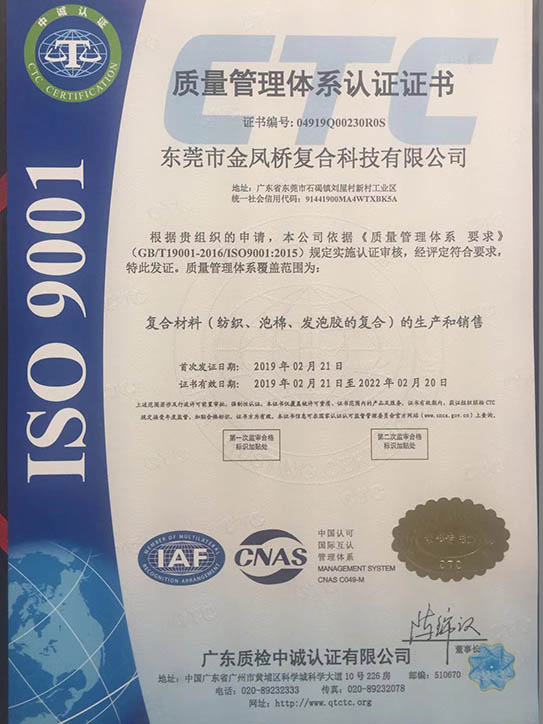 为进一步规范公司业务流程、有效控制风险,形成标准化经营、规范化管理的模式,金凤桥复合科技有限公司从战略的眼光出发,自2018年开展导入ISO9001质量管理体。在2019/2/22日并顺利通过了中国质量认证中心认证和审核。