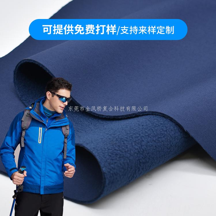 3、三层复合:表面针织布+TPU膜+绒布,在防水透汽的基础上,增加了保暖御寒的特点,是秋冬季节服装常用的一款复合面料。